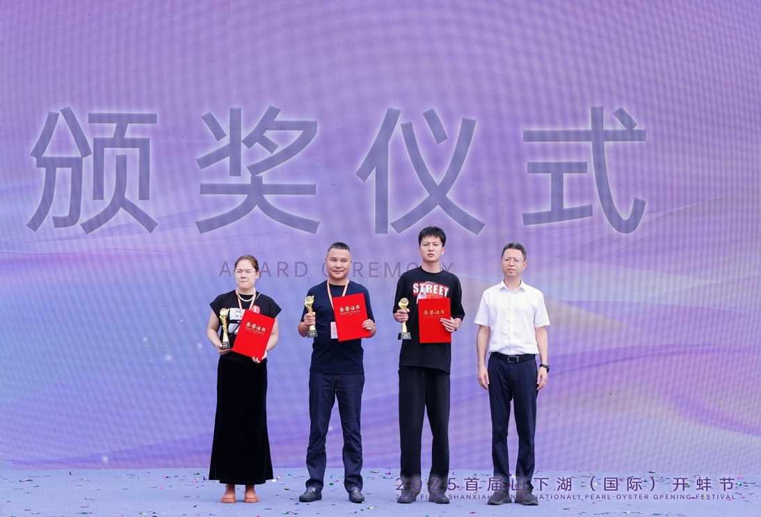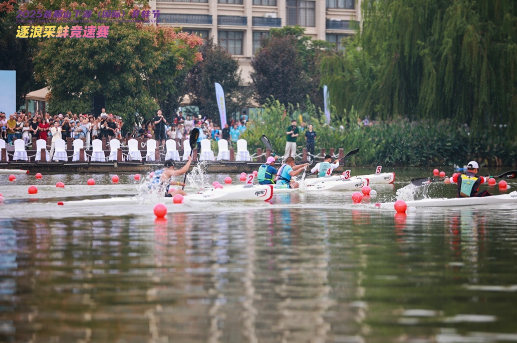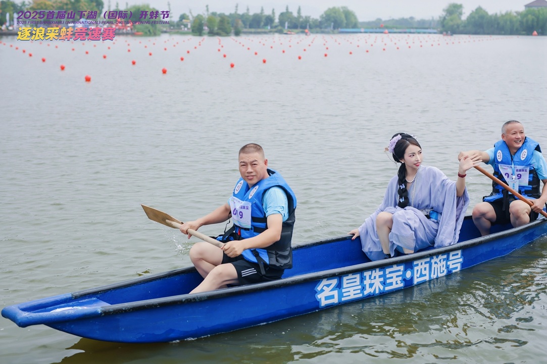 “逐浪采蚌竞速赛”集结了珍珠企业代表、外国友人等组成的多支参赛队伍,各队伍以“企业名称+西施号”为团队船只命名。比赛中,不仅展开速度与技巧的较量,更在协作采蚌的过程中,集中展现了珍珠养殖、采制等传承千年的传统技艺,让现场观众直观感受珍珠产业的源头魅力。