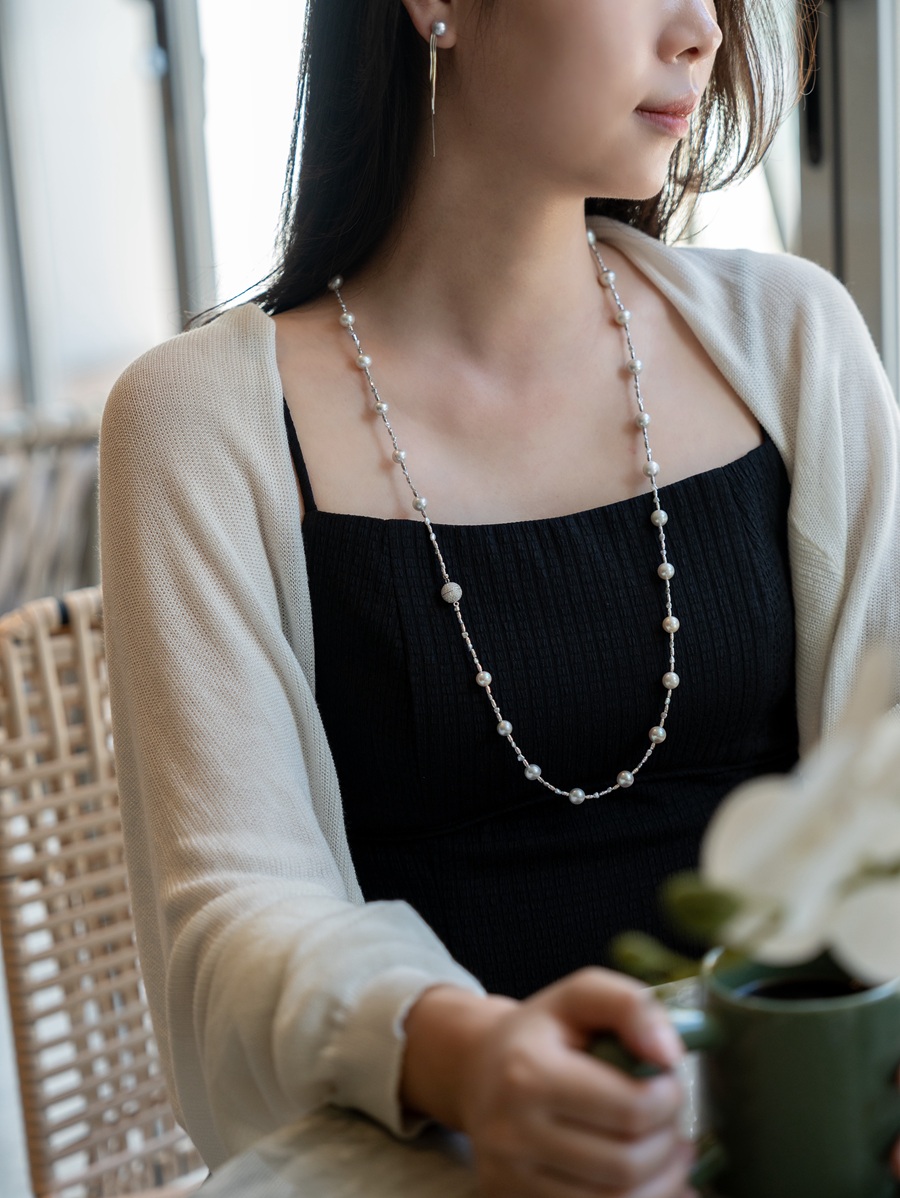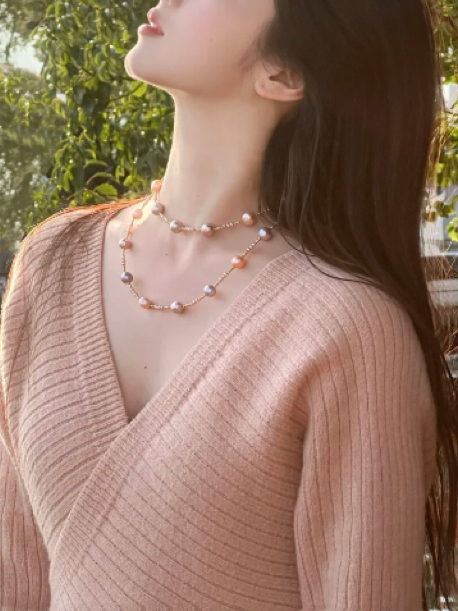 在满足日常佩戴的多元场景中,“莫奈光影-橘子海糖果项链”以灵活多变的设计诠释现代珠宝的实用美学,赢得了消费者的青睐。无论是作为Y字链、长款毛衣链,还是绕两圈成为CHOKER,它都能轻松适配不同穿搭风格。温柔清新的糖果色系珍珠,结合灵活多样的佩戴方式,不仅提升了单品的实用性与时尚感,也展现出MiNG名皇在设计上对现代女性日常佩戴需求的深度洞察。