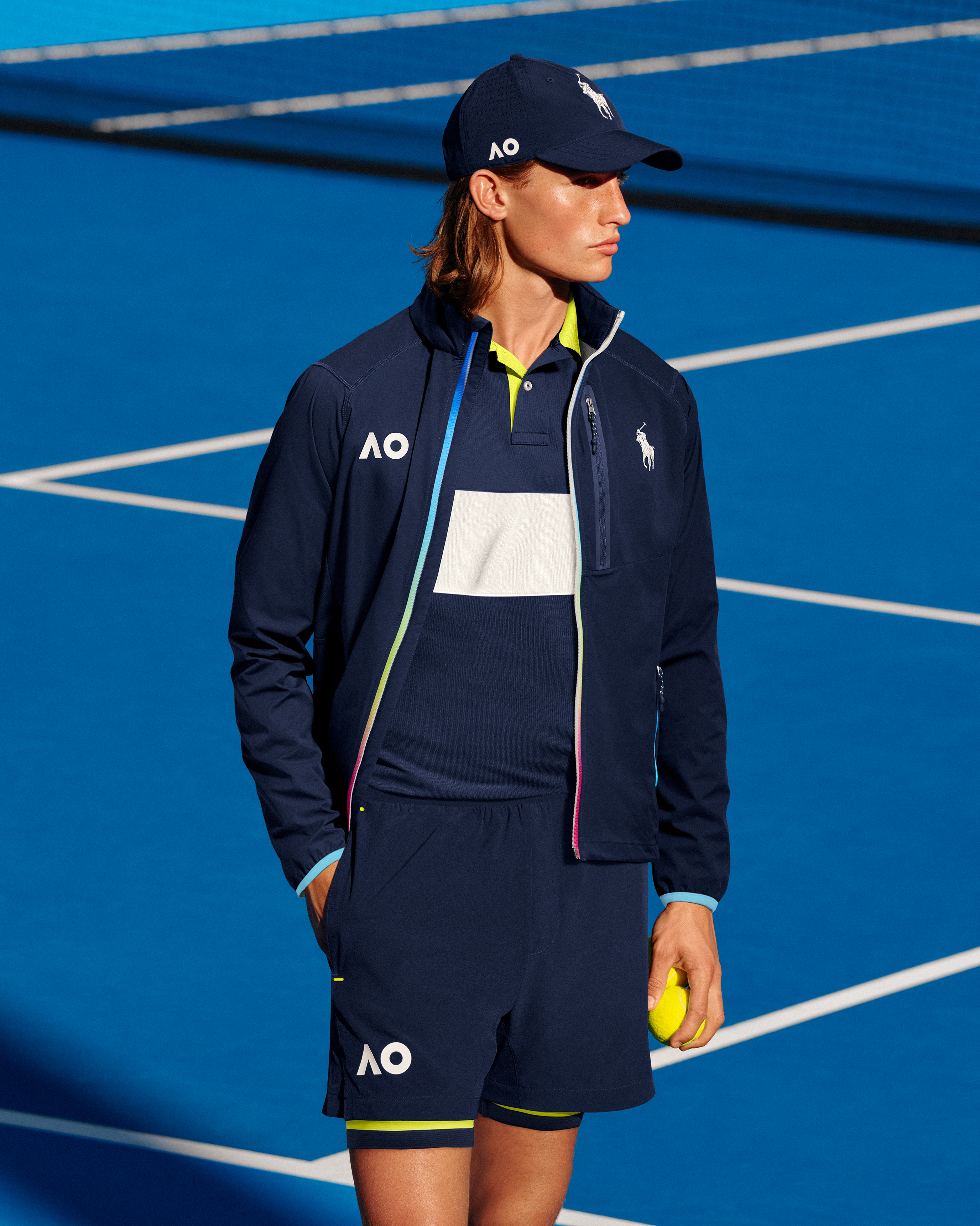 澳网是全世界网球爱好者的欢聚盛宴,它以缤纷多彩的赛场布置、热烈欢欣的竞技气氛和注重娱乐性的观赛体验著称,又被称作“快乐大满贯”。自2008年起,澳网便将网球场地由传统的绿色改为鲜明的蓝色,形成了不囿常规、独具特色的“澳网蓝”景观,一显这项年轻赛事求新求变的前卫风范。这份追求自由与创新的勇气,亦与Ralph Lauren拉夫劳伦“不被定义、做自己”的品牌性格高度共鸣,成为品牌与澳网合作的鲜明底色。Ralph Lauren拉夫劳伦为2026年澳网工作人员制作的服饰同样以蓝色作为主调,用吸睛的荧黄、亮蓝、银白等色与静谧的暗蓝碰撞,既昭示了澳网于悠久的网球传统中发掘个性、张扬自我的活力,亦融入了品牌沉实、低调、富有古典气息的美学风格,俨然一支传统与摩登交会、古朴与新生并存的协奏。在材质选择上,为应对澳大利亚炎热的夏季,Ralph Lauren拉夫劳伦采用了具备吸湿排汗、防紫外线效果的布料,并践行可持续发展的承诺,以可回收聚酯纤维为制作材料打造赛事球童制服,尽显品牌细腻缜密的实穿主义色彩。