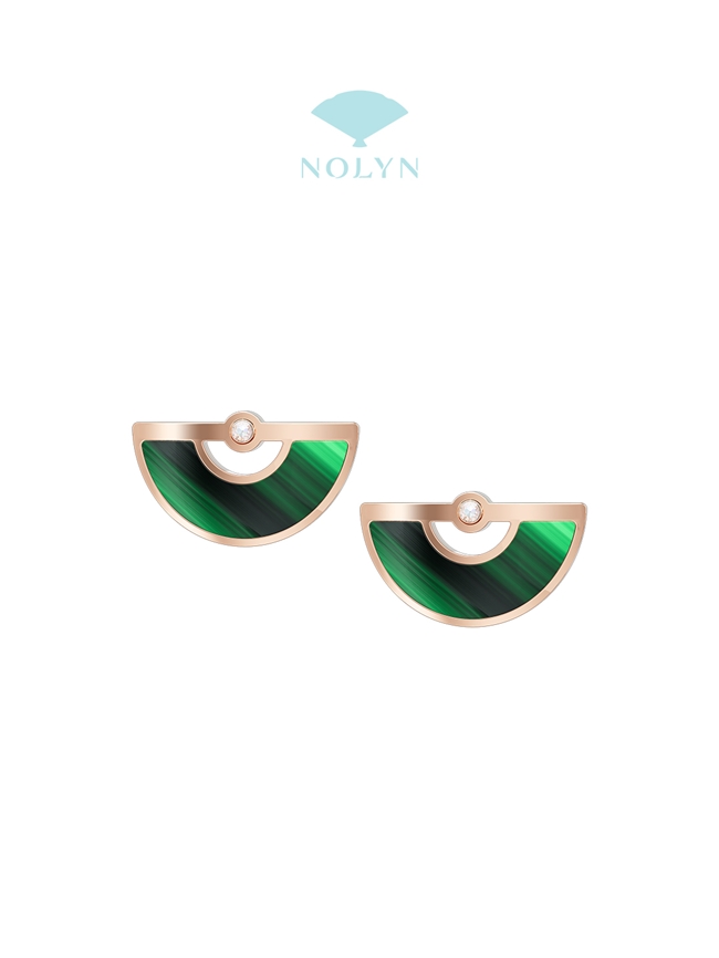 设计亮点:耳钉造型为圆润的扇形弧面,完美贴合耳垂轮廓。中央镶嵌的孔雀石,切割光滑色泽浓郁,带有天然的生长纹路,每一枚都独一无二。背部的耳针与托架焊接牢固,采用防过敏材质,确保日常活动、接听电话都毫无负担。