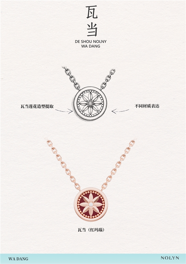 针对这一痛点,诺麟珠宝以宋韵美学为切入点,将传统吉祥符号进行现代化转译,既保留了新年的福运寓意,又凭借极简设计摆脱俗气,兼顾年味与品味。诺麟莲花纹瓦当、麟趾金、海棠纹等元素,用简约线条重构,摒弃传统设计的浮夸感,实现“轻国风”表达,既有传统文化的厚重感,又贴合当代年轻人的审美偏好。