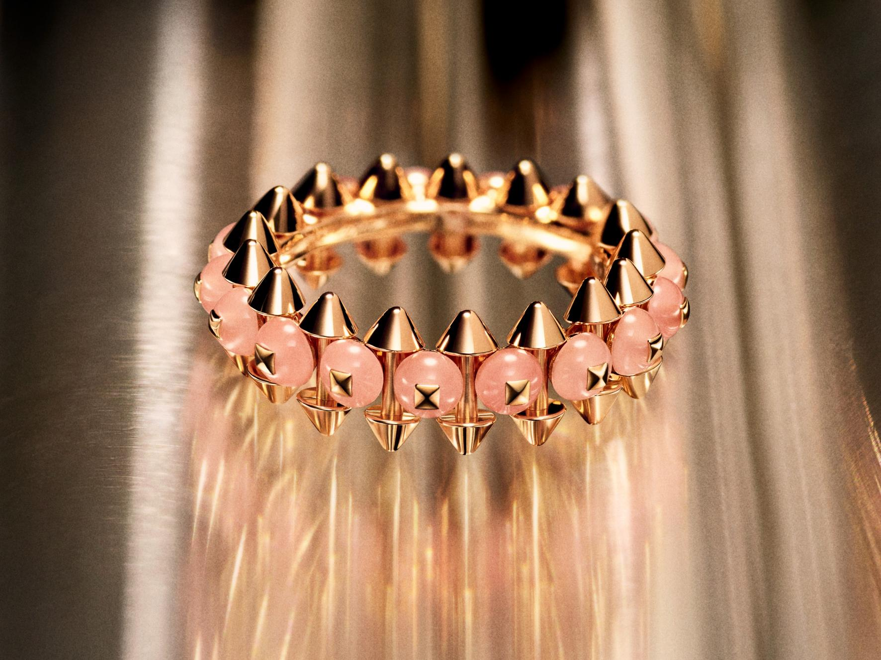红色玛瑙或绿色玛瑙、粉色玉髓与缟玛瑙的缤纷色彩,令Clash de Cartier系列呈现丰富美感。精致圆珠与玫瑰金铆钉交错排列,凸显系列戒指、项链与耳环作品富有建筑感的立体造型。